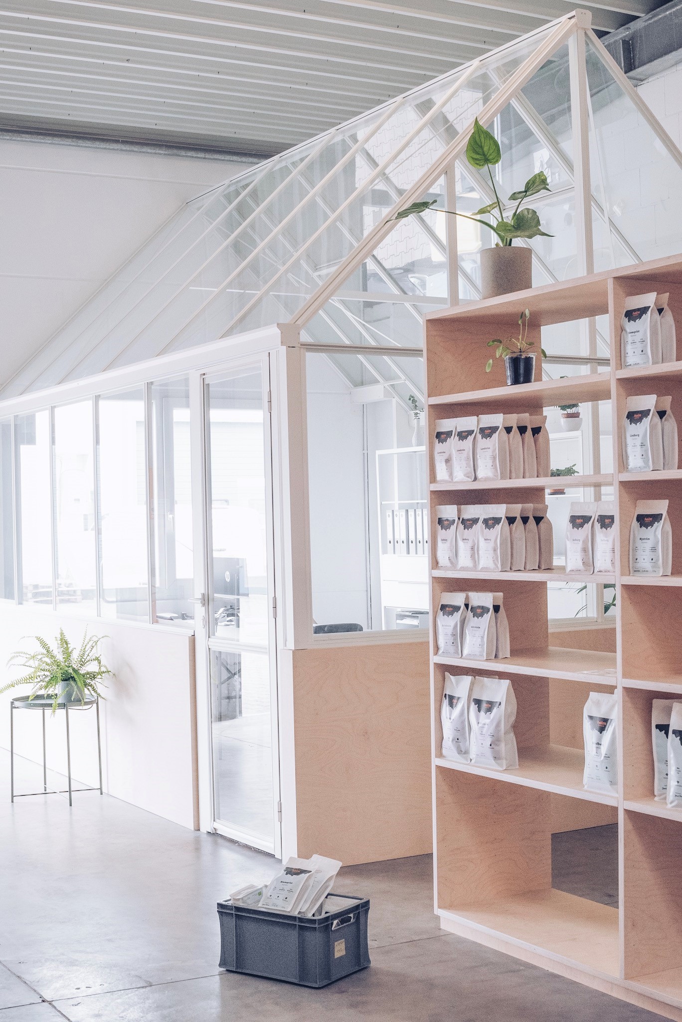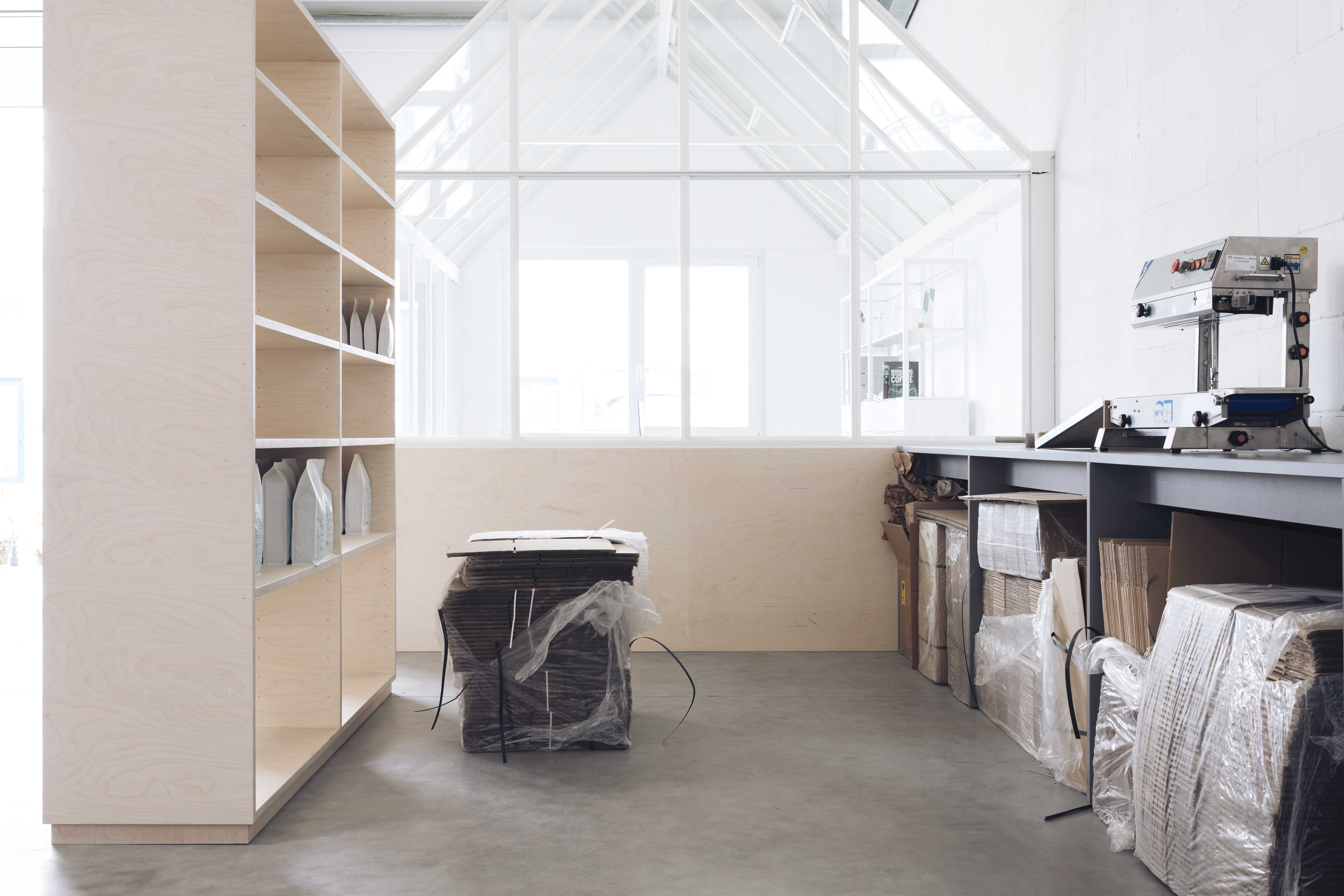 Das junge Kölner Start-up Unternehmen „Holm Kaffeerösterei“ verfolgt die Idee eine Erlebnis-Kaffeerösterei zu entwickeln in welcher die eigenen Kaffeeprodukte optimal demonstriert und Kunden im besonderen Ambiente betreut werden können. Um dieses Konzept umzusetzen galt die Herausforderung den raren Lichteinfall der ca. 100 m² großen Halle mit nur einem Fenster optimal zu nutzen und zu erhalten – dazu haben wir gemeinsam eine Raum in Raum Lösung gefunden welche dies ideal ermöglicht.Technische Daten: